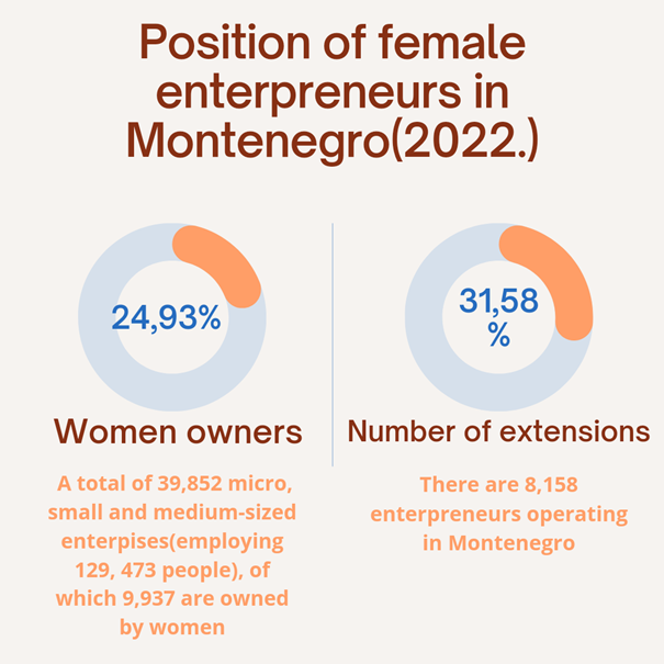 Since 2015 the Govrenment has been occasionaly enacting and implementing strategic policies in the field of female entrepreneurship, and was investing additional efforts in strengthening it. Is it enough? Not yet, given that there is still no equality for women in this area. We cannot, as I stated, blame anyone, but we cannot and must not stop trying to change something. The government allocated free funds to support female entrepreneurship and youth entrepreneurship, and on July 6, 2023, it adopted the Report on the Implementation of the Action Plan for the Implementation of the Strategy for the Development of Female Entrepreneurship in Montenegro 2021-2024. Previous data of the Ministry of Economic Development and Tourism, at the end of 2022, showed that kosthe situation is as follows: